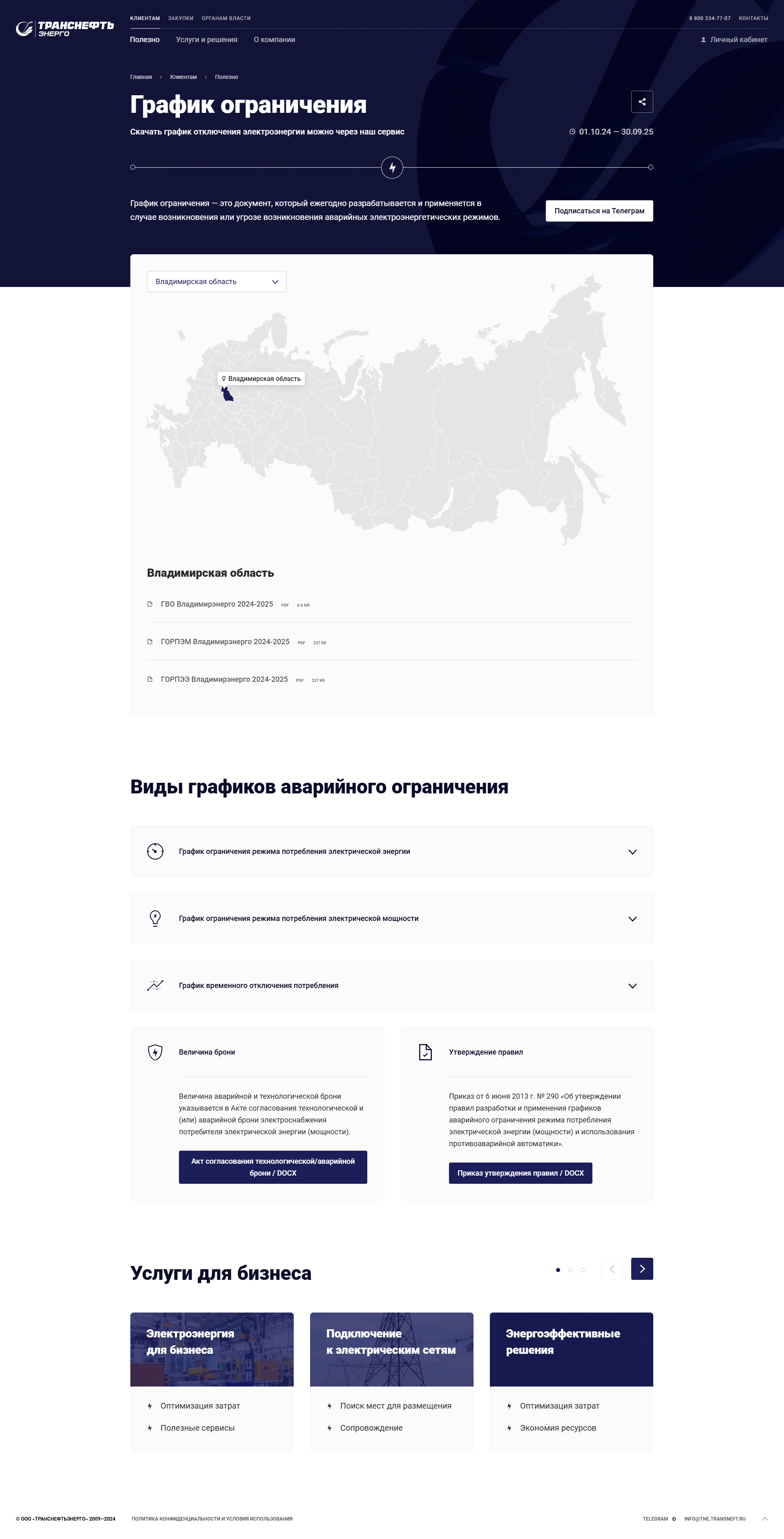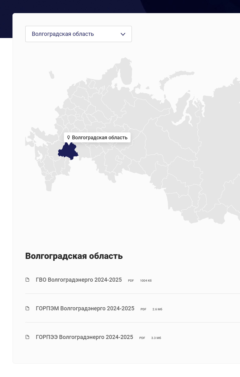 Полезный сервис для энергетиков с интерактивной картой регионов Российской Федерации, отображающей графики ограничения электроэнергии. Для выбора региона доступны два способа: клик по карте или использование выпадающего меню с внутренним поиском. При наведении на регион всплывает тултип с его названием.