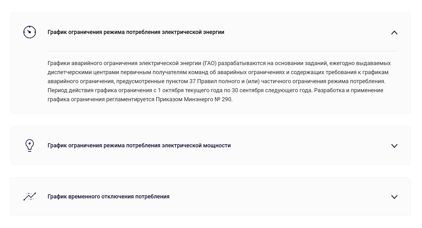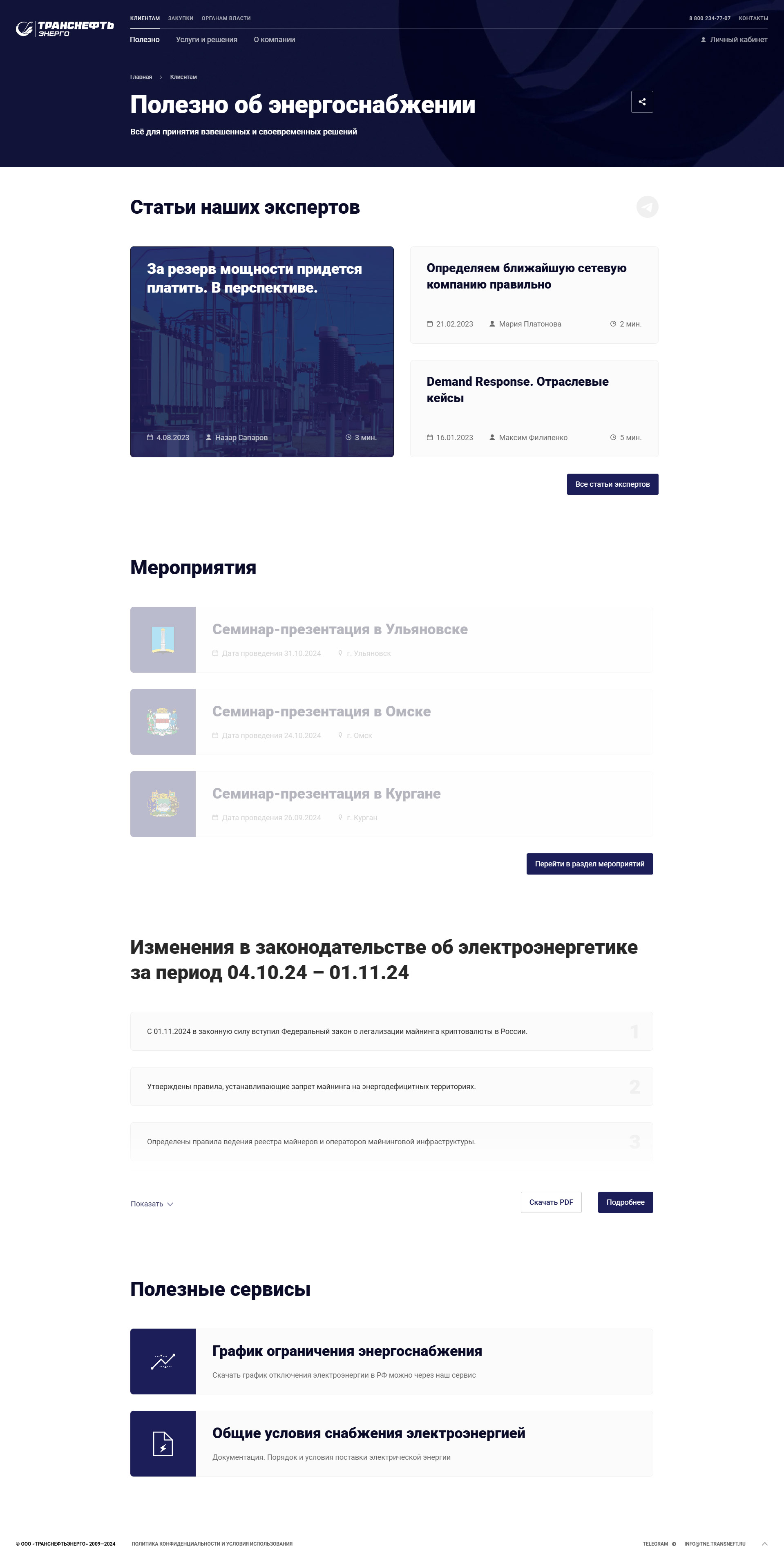 Раздел «Полезно об энергоснабжении» объединяет несколько тематических блоков: статьи, анонсы мероприятий, обзоры изменений в законодательстве электроэнергетики, а также полезные сервисы.