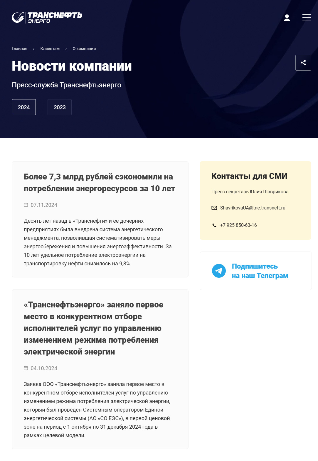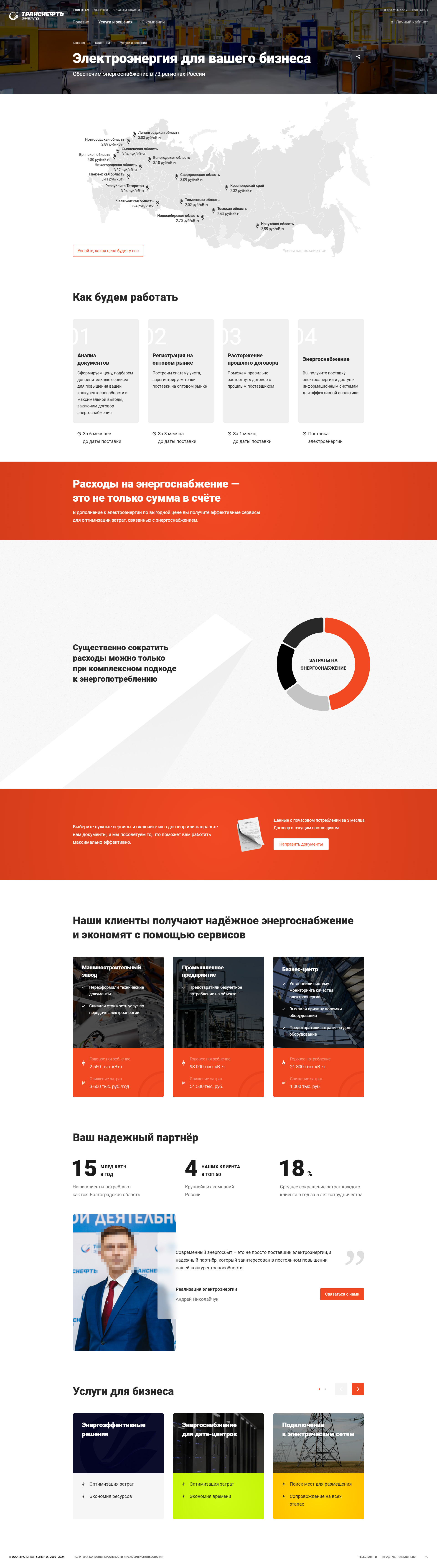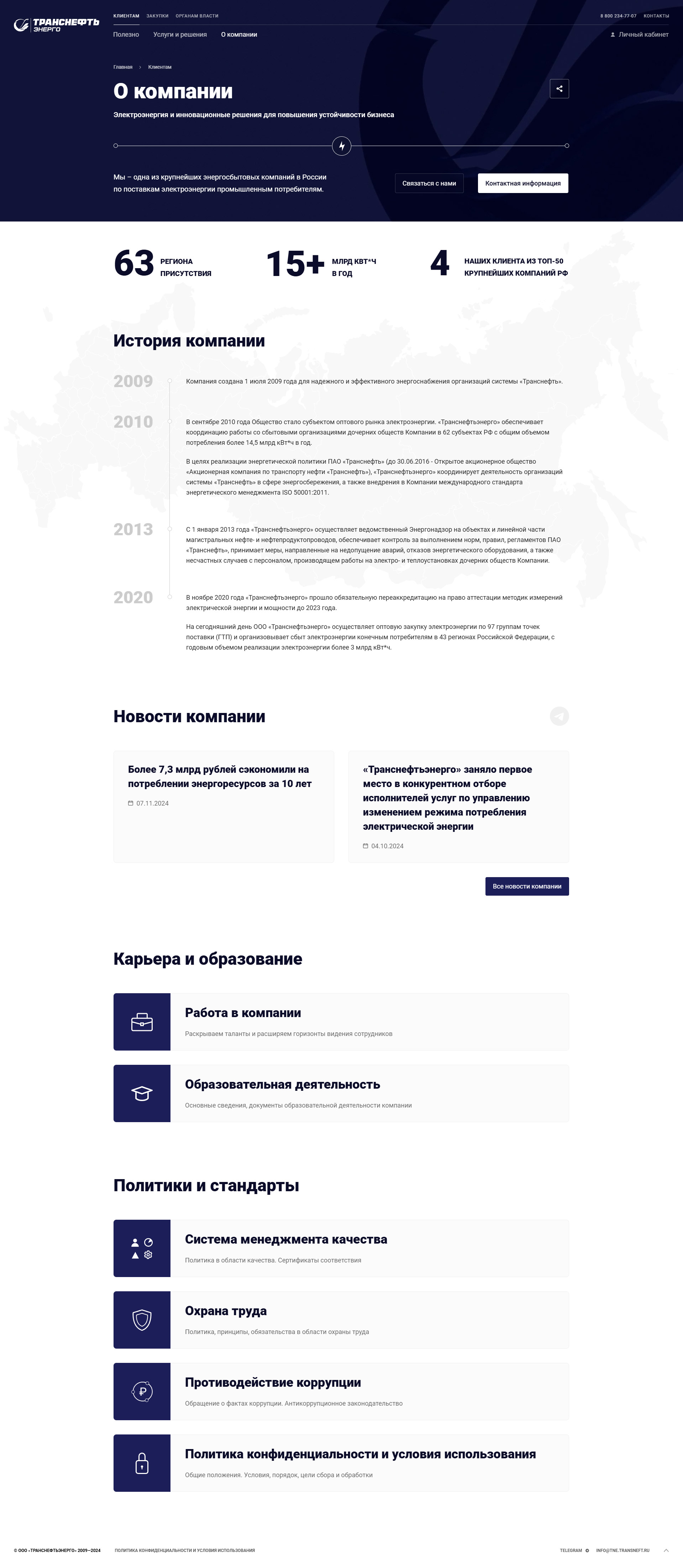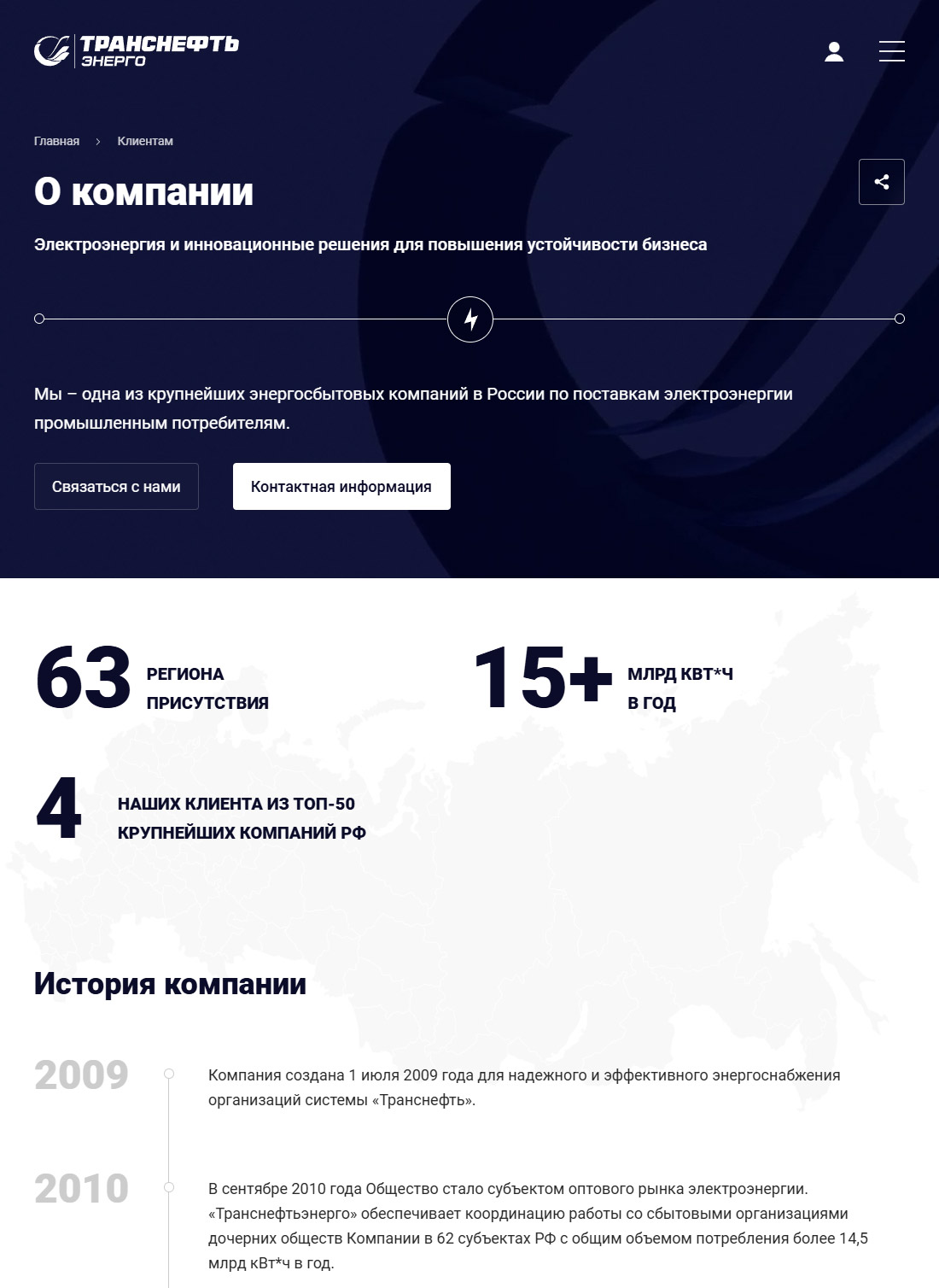 Для энергоснабжающей компании «Транснефтьэнерго» разработан корпоративный веб-сайт, который включает в себя отзывчивый дизайн и вёрстку для работы на любом устройстве, интеграцию с CMS, продвижение в поисковых системах с помощью SEO и контекстной рекламы. Проект реализован в сотрудничестве с клиентом в гибридном формате работы.
