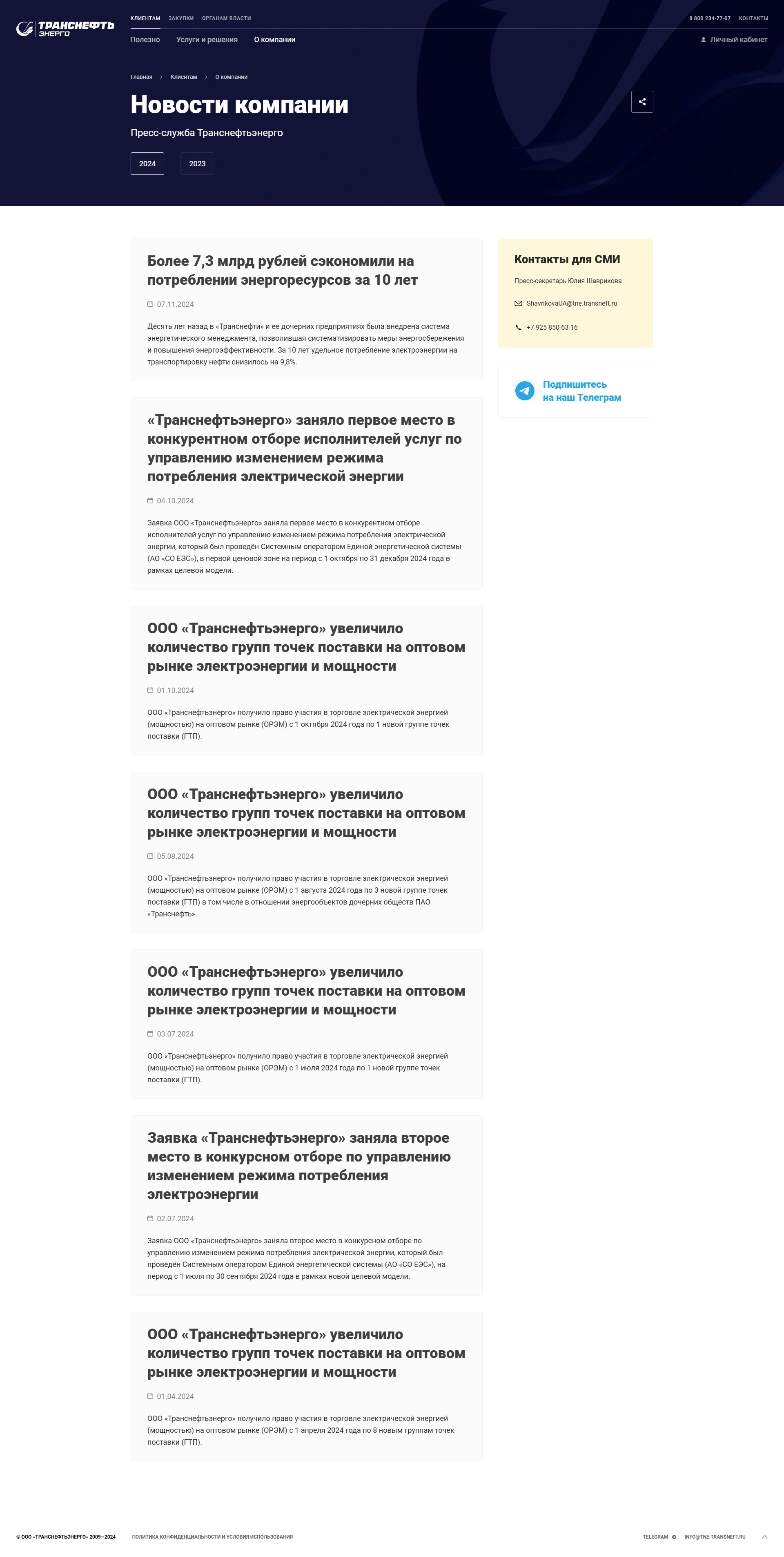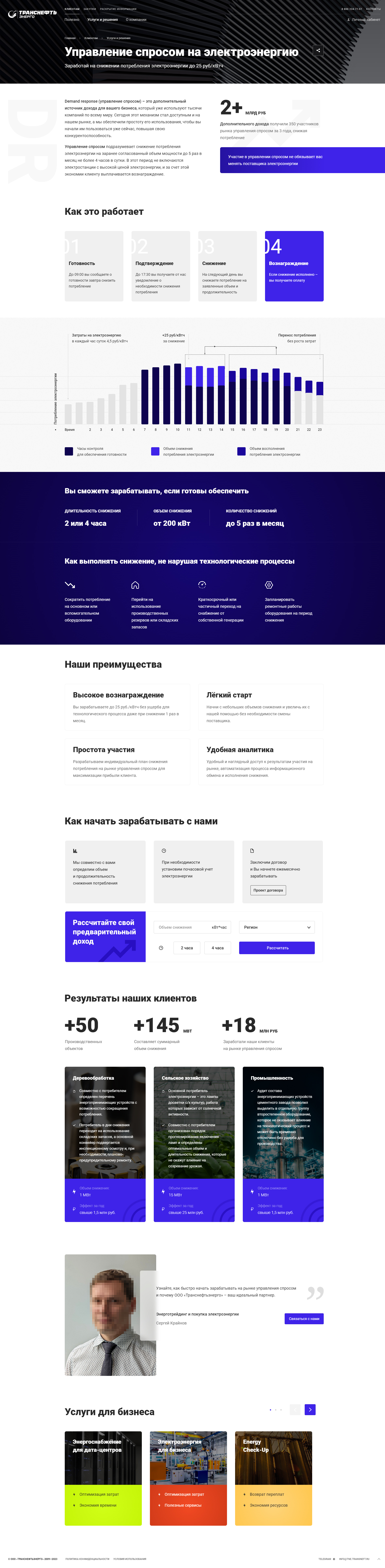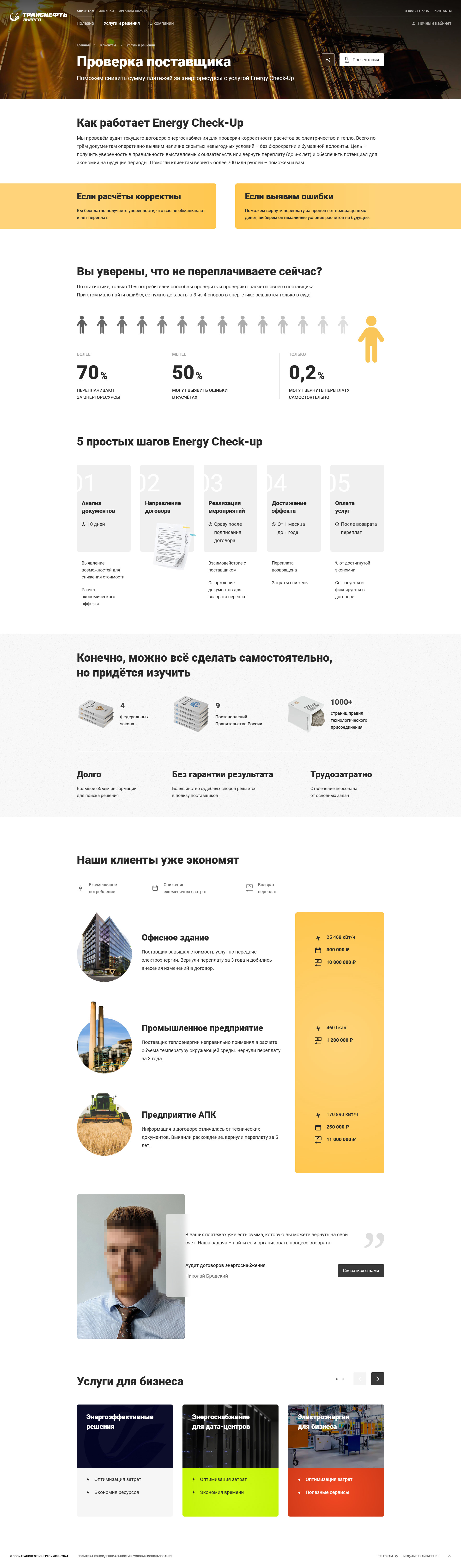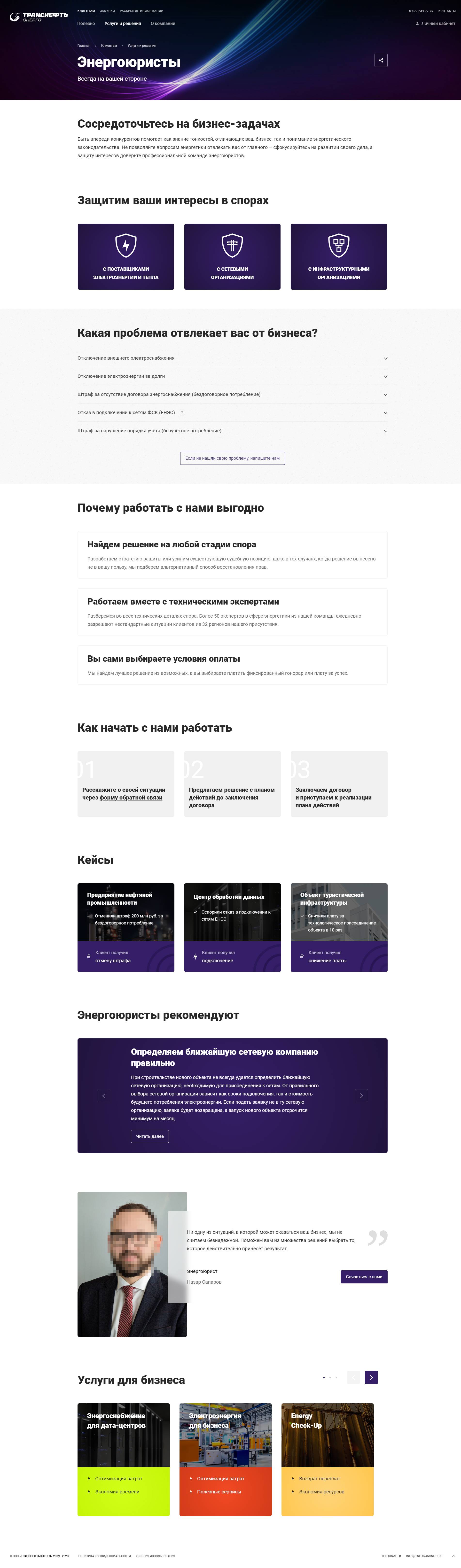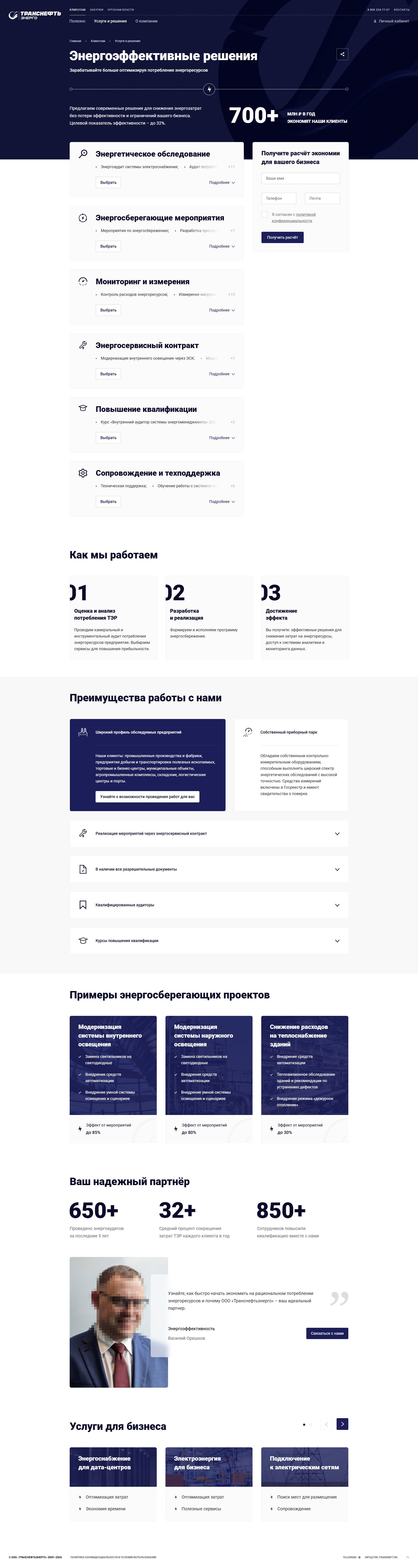 Для энергоснабжающей компании «Транснефтьэнерго» разработан корпоративный веб-сайт, который включает в себя отзывчивый дизайн и вёрстку для работы на любом устройстве, интеграцию с CMS, продвижение в поисковых системах с помощью SEO и контекстной рекламы. Проект реализован в сотрудничестве с клиентом в гибридном формате работы.