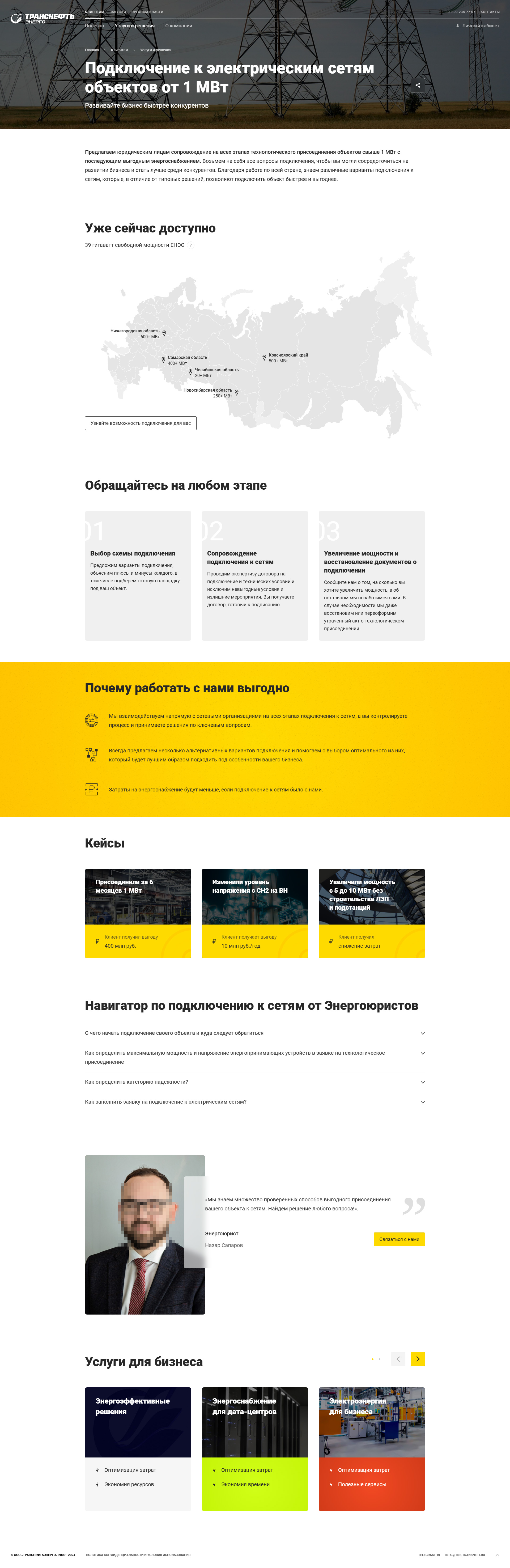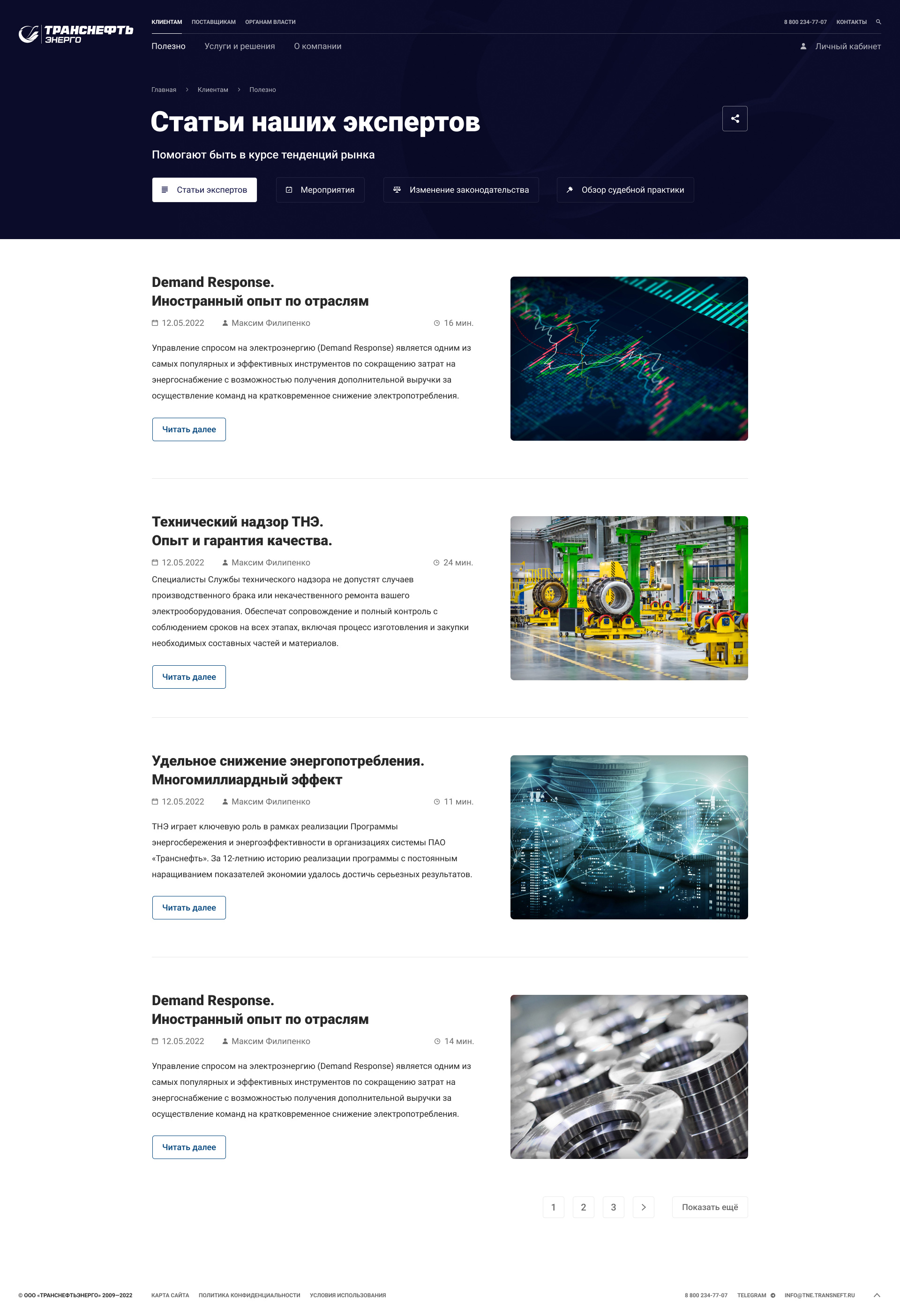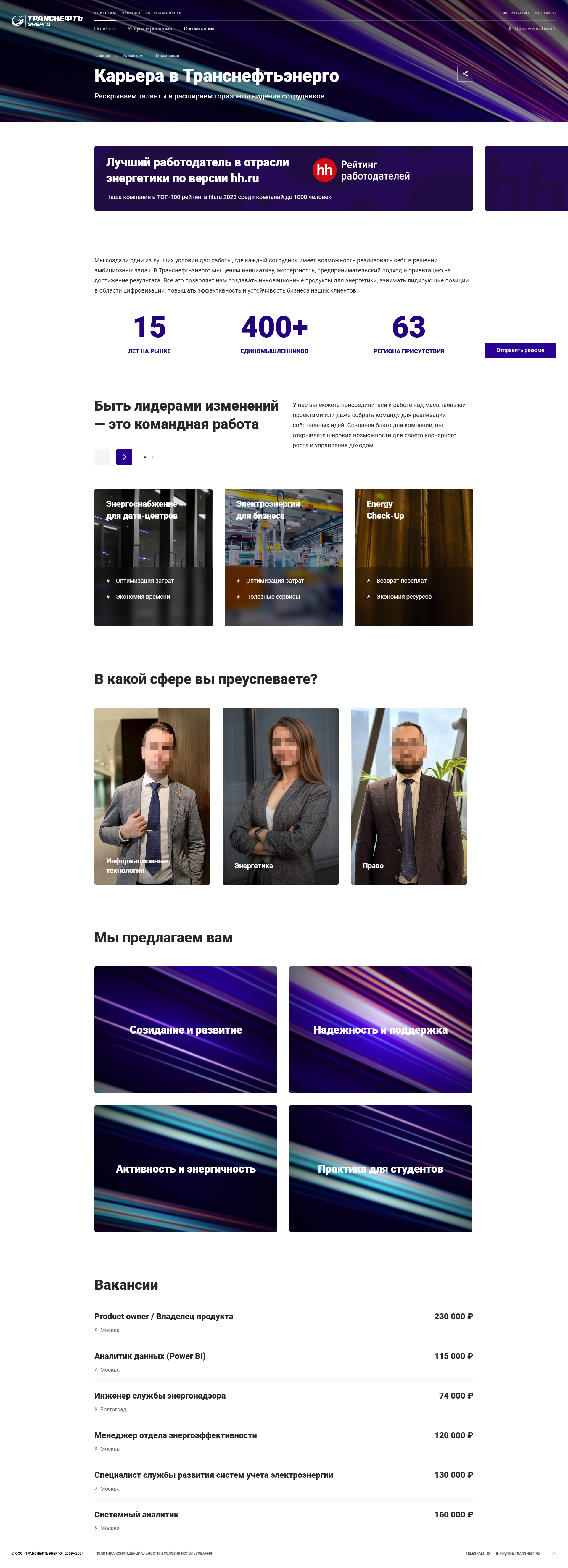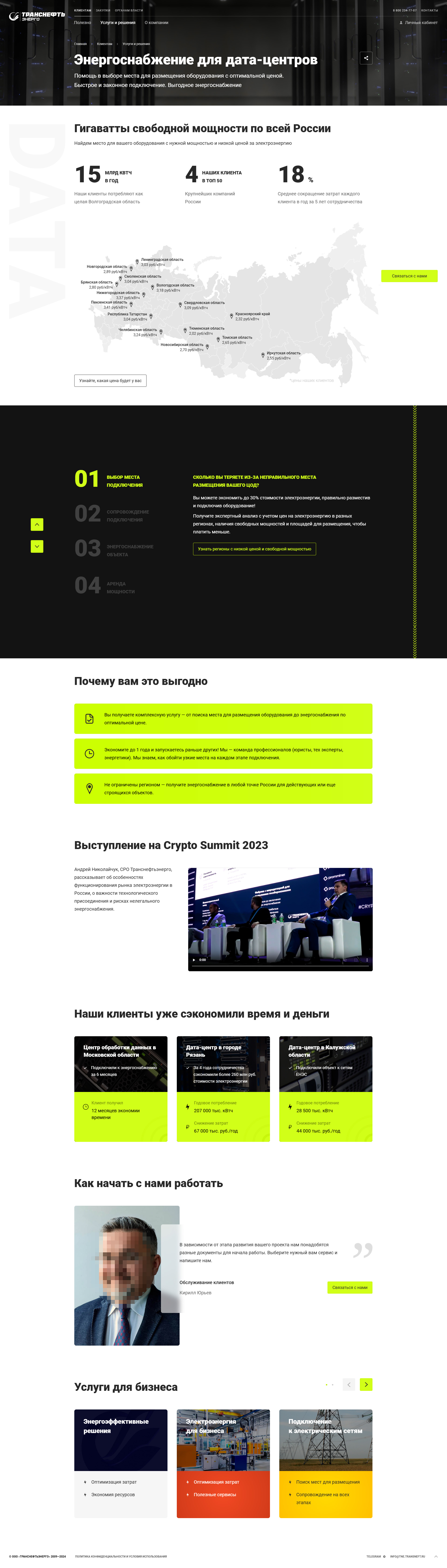 Для энергоснабжающей компании «Транснефтьэнерго» разработан корпоративный веб-сайт, который включает в себя отзывчивый дизайн и вёрстку для работы на любом устройстве, интеграцию с CMS, продвижение в поисковых системах с помощью SEO и контекстной рекламы. Проект реализован в сотрудничестве с клиентом в гибридном формате работы.