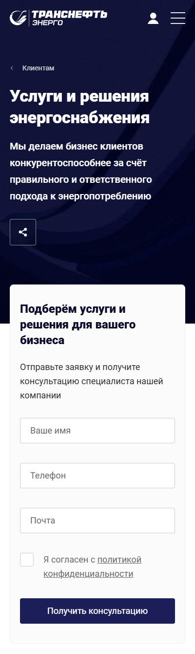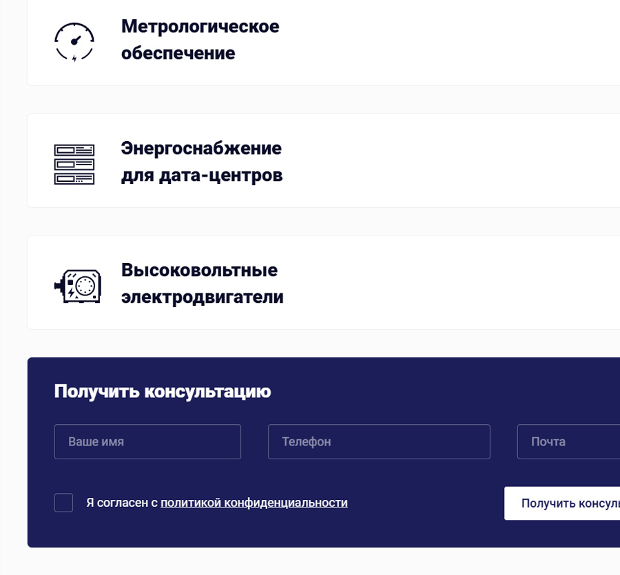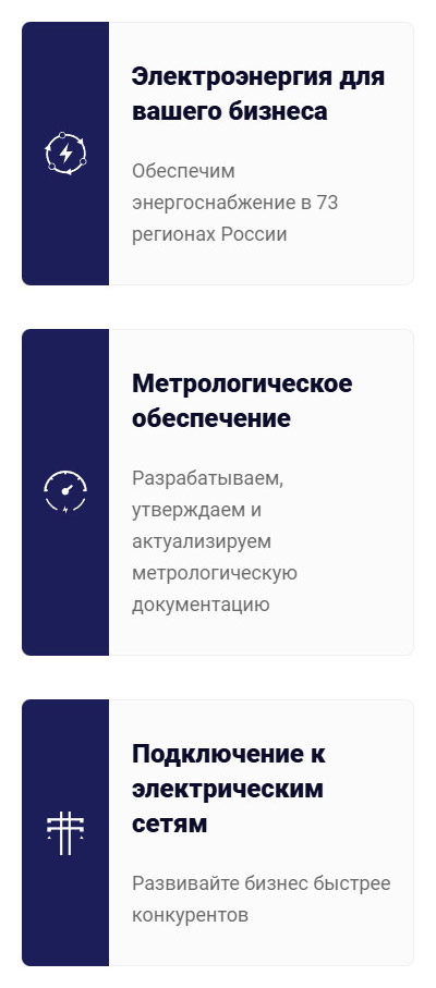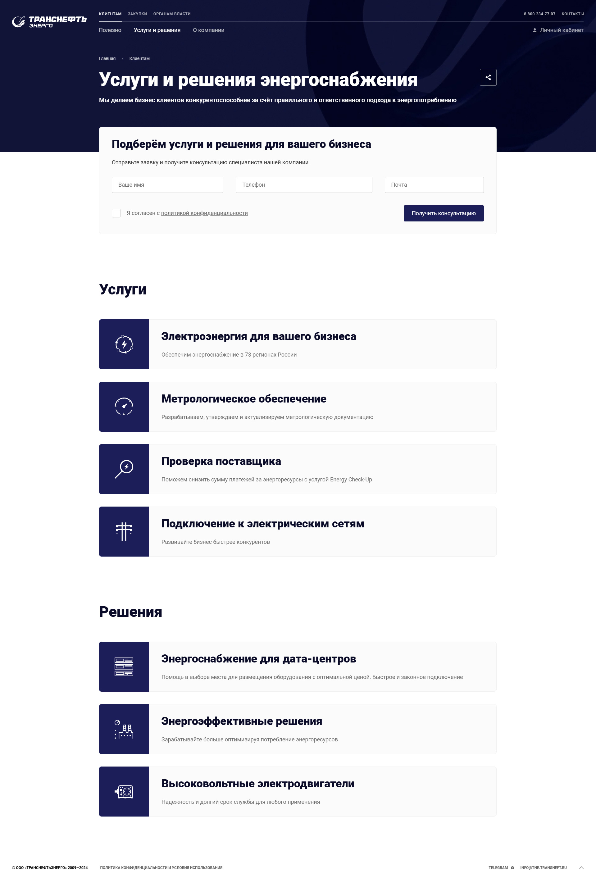 На странице «Услуги и решения энергоснабжения» размещены призыв к действию (CTA) с предложением получить консультацию, а также карточки с краткими описаниями услуг и решений. Клик по каждой карточке ведёт на страницу соответствующего раздела.