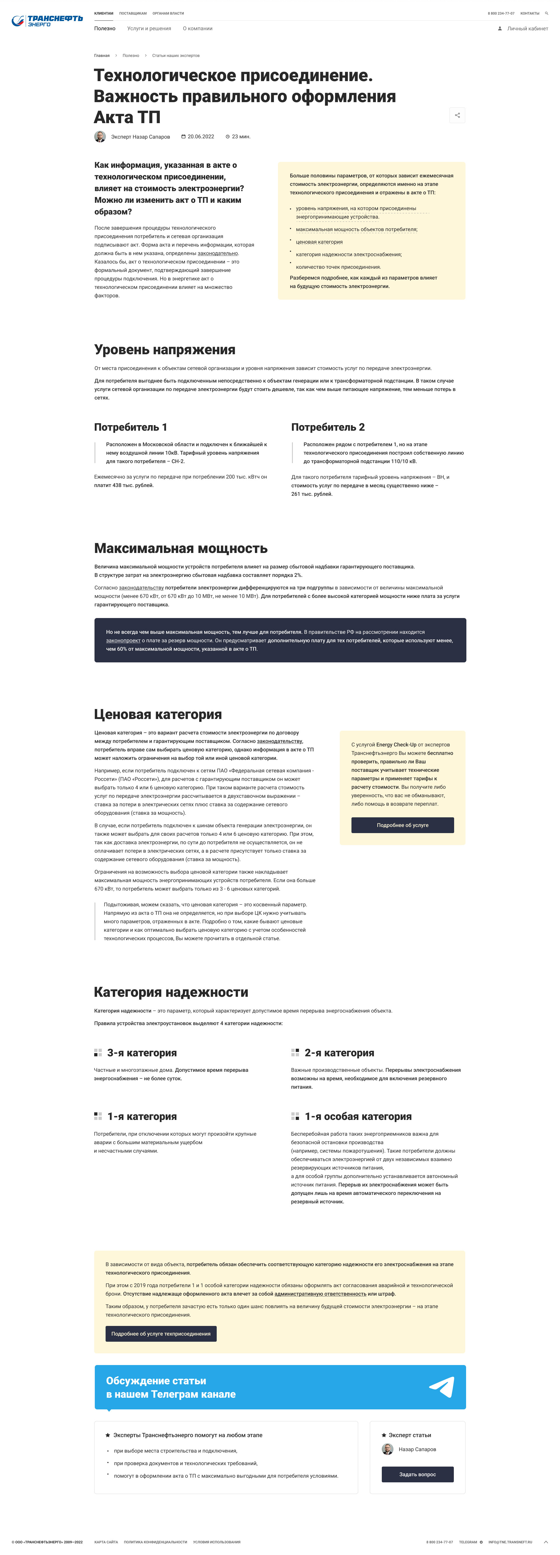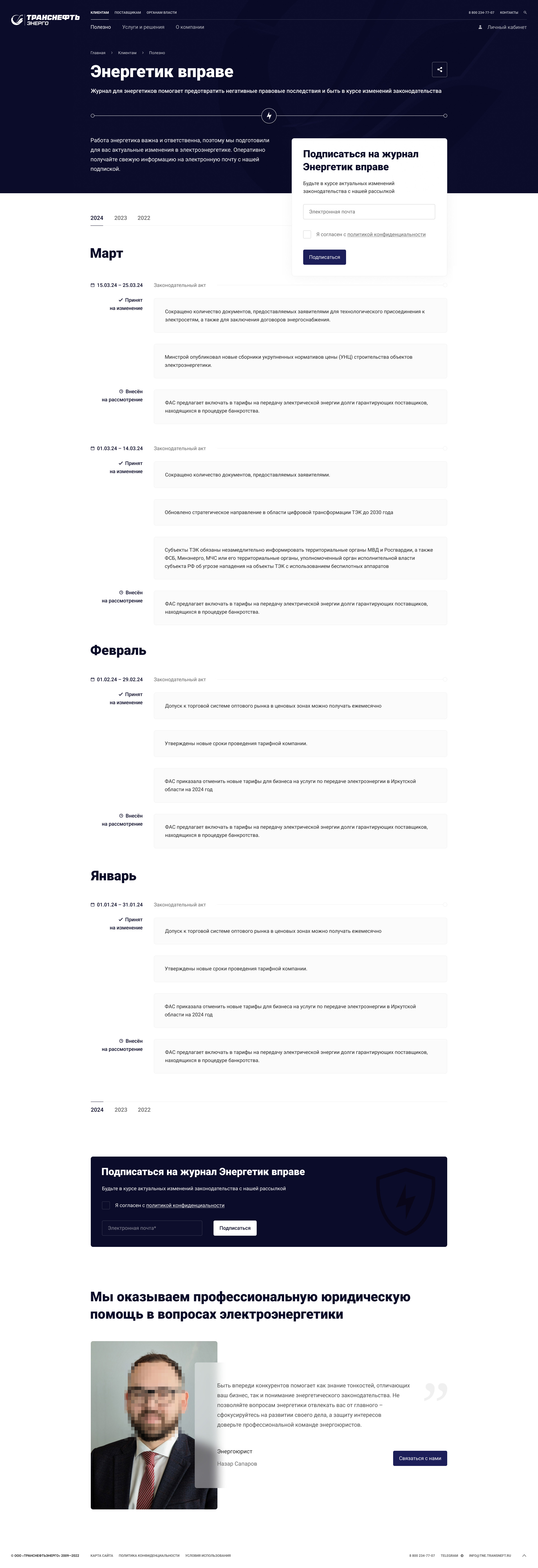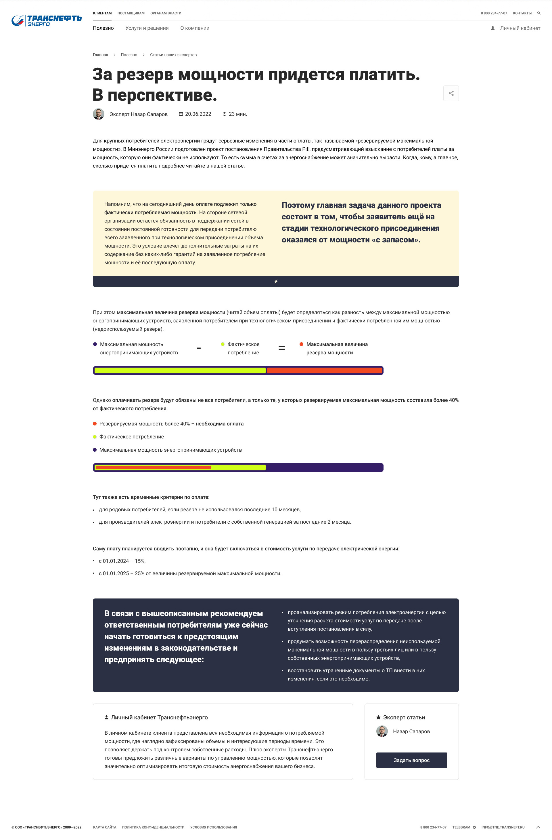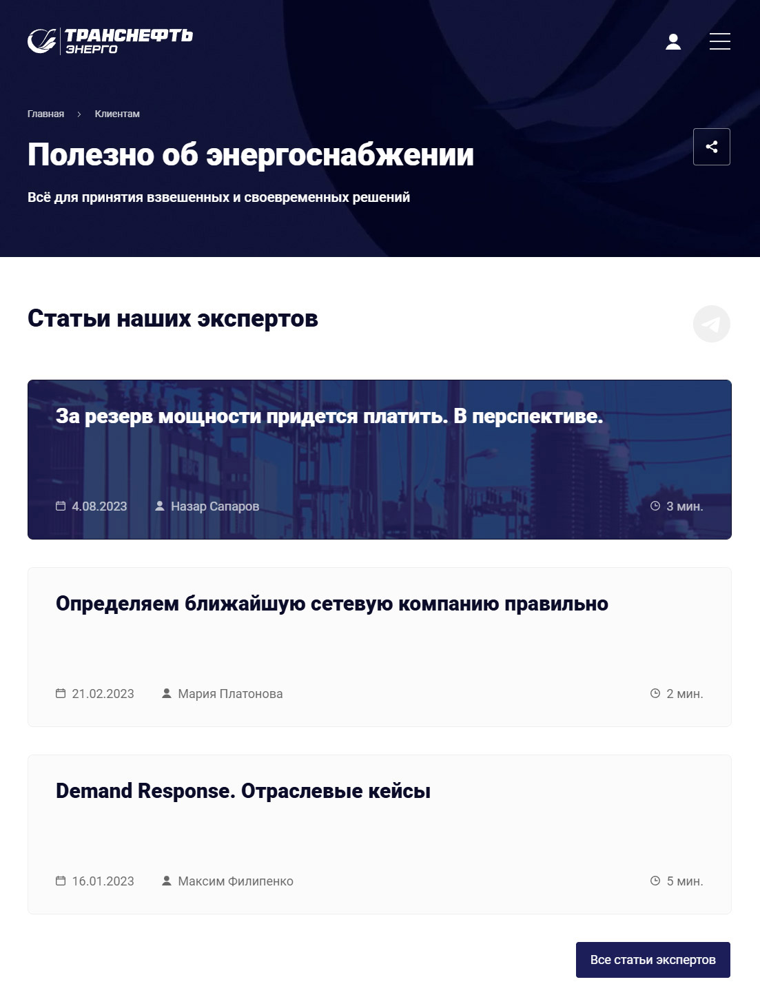 Для продвижения страницы используется специальный статейный блок «Энергоюристы рекомендуют», который также доступен в разделе «Полезно».