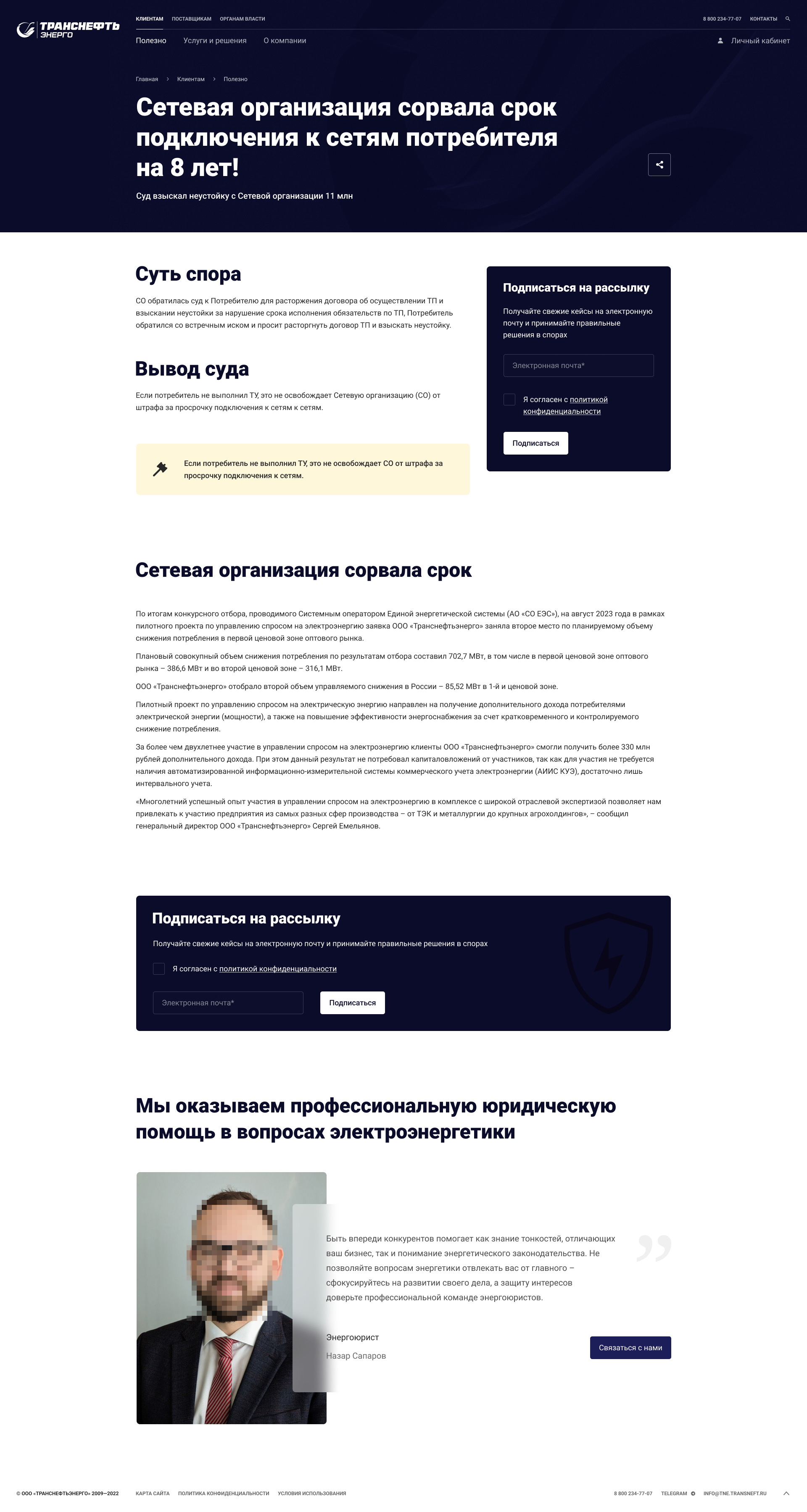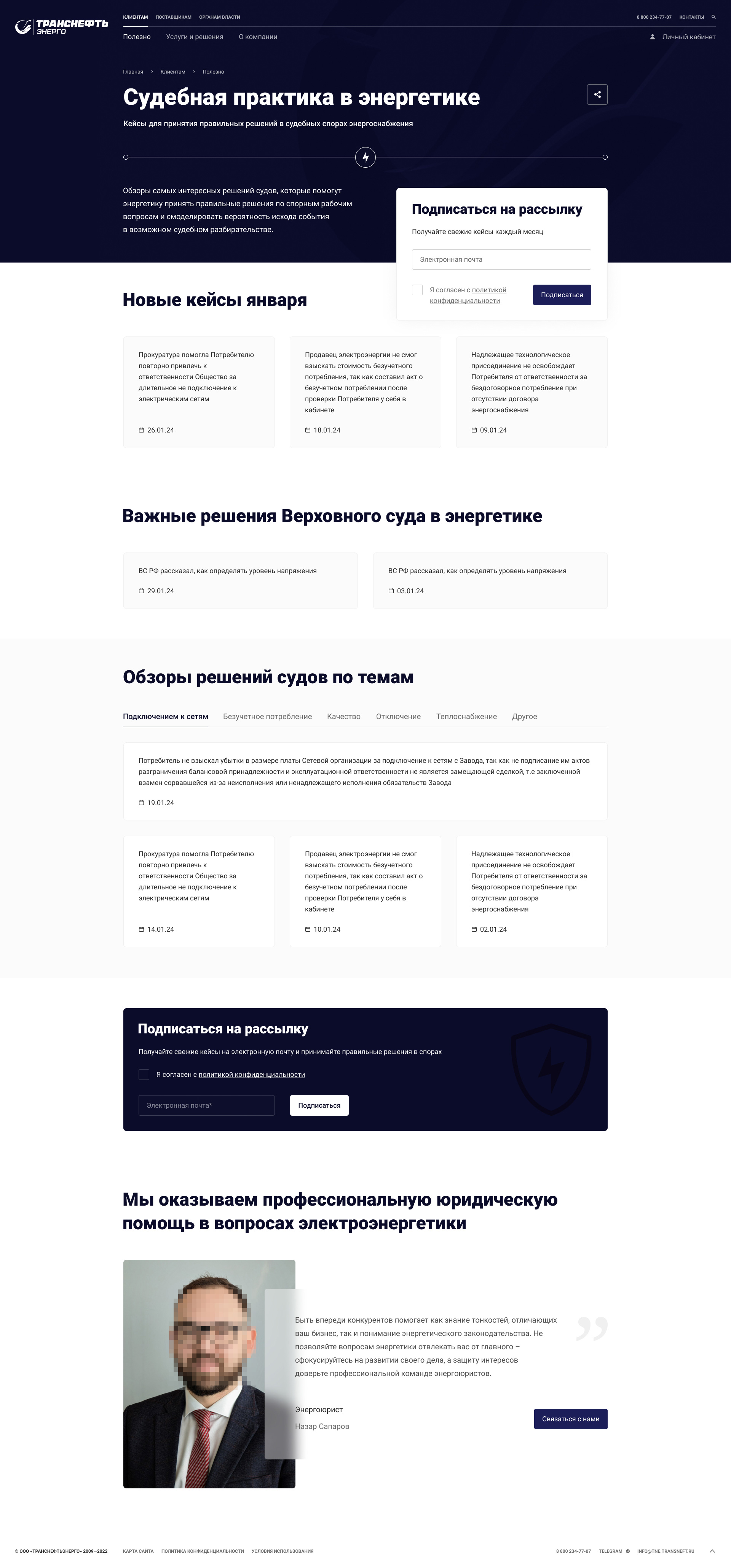 Пользователь может изучить интересные судебные кейсы в энергетике и подписаться на их ежемесячную рассылку.
