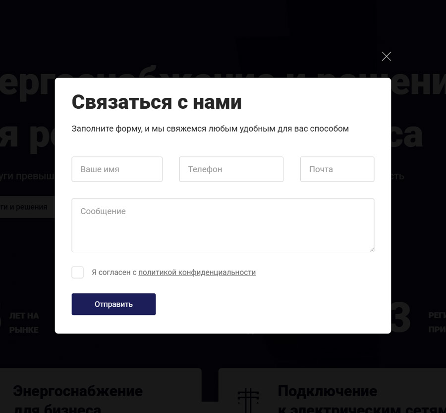 На странице реализована функция обратной связи через форму «Связаться с нами».